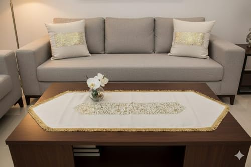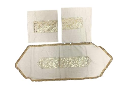 • مجموعة ديكور رمضان كاملة: تتضمن مفرش طاولة أنيق وغطائي وسادة متطابقين يتميزان بتصميمات إسلامية جميلة مطرزة باللون الذهبي مع نجوم وهلال وخط عربي