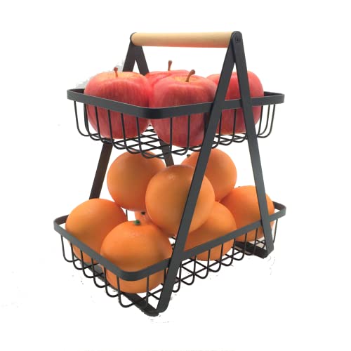 SHIN·YIK - سلة فاكهة من طبقتين لسطح الطاولة، وعاء تخزين الفاكهة، سلة منتجات الخضروات، مقاومة للصدا مع مقبض خشبي، رمادي -