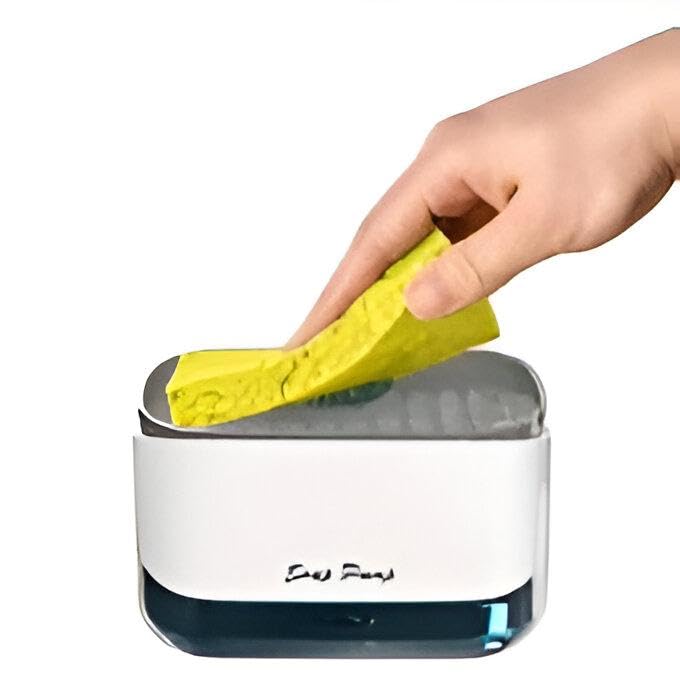 - This 2-in-1 product combines a soap dispenser with a sponge holder, offering a compact and practical solution to keep cleaning tools organized on the countertop while maintaining water away from kitchen surfaces.