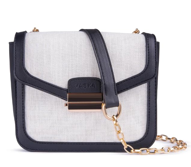 Generic - Small Crossbody Handbag, Canvas and Faux Leather, White with Black Trim, Gold Chain Strap