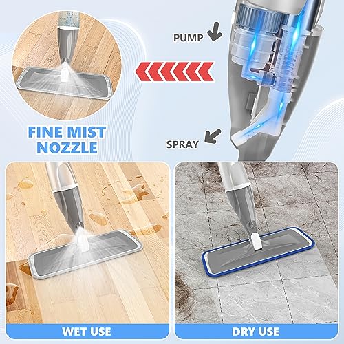 PAPCLEAN - ممسحة مايكروفايبر ببخاخ لتنظيف الارضيات الصلبة والغبار الرطب، ممسحة مسطحة لتنظيف الارضيات مع 4 وسادات قابلة للغسل سعة 440 مل، زجاجة قابلة لاعادة ملء الأرضيات الخشبية والبلاط والفينيل والمطبخ