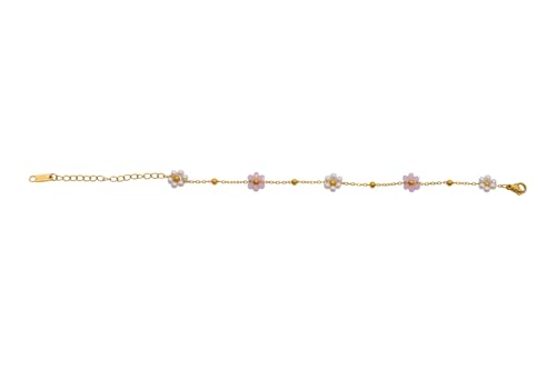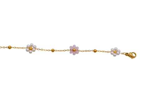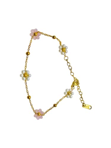 Generic - Stainless Steel Pink And White Bead Flowers Women's Bracelet with Lobster Clasp, Free Size - Gold