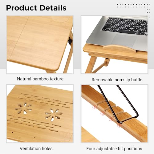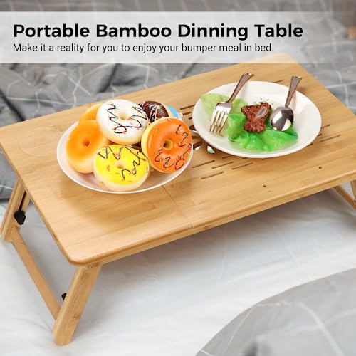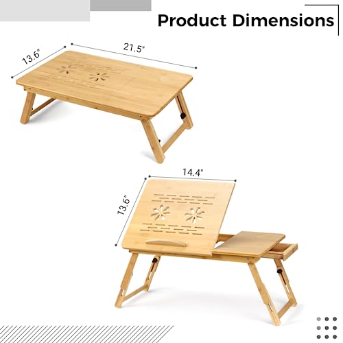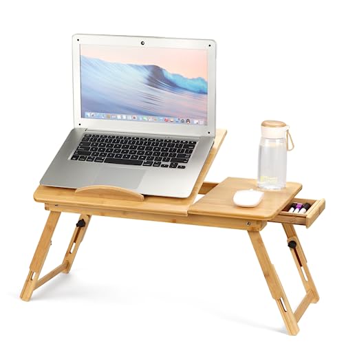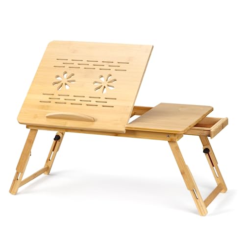 SWEWARM - Bamboo Laptop Desk, Foldable Lap Bed Desk, Bamboo Lap Desk with Tilting Surface, Portable Breakfast Serving Bed Tray, Height Adjustable Laptop Desk with Drawer