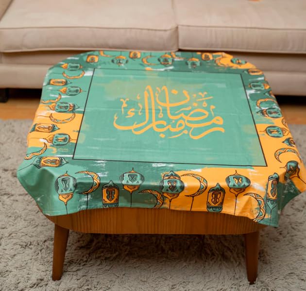 Generic - مفرش طاولة مع خط عربي، تصميم فانوس ازرق مخضر وبرتقالي، قماش مخملي ناعم، متوفر بمقاسات متعددة، 90 × 90 الى 140 × 280 سم (90 × 90)