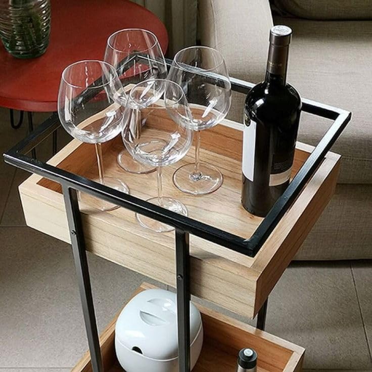 • MODERN DESIGN: Stylish bar cart featuring natural wood storage boxes and sleek black metal frame, perfect for contemporary living spaces