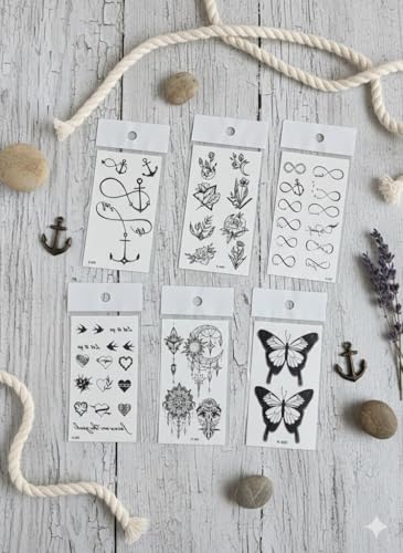 • محتوى المجموعة: تتضمن 6 قطع من ملصقات الوشم المؤقت بتصاميم متنوعة تشمل الفراشات الملونة والريش والشفاه وماسك الأحلام والزهور