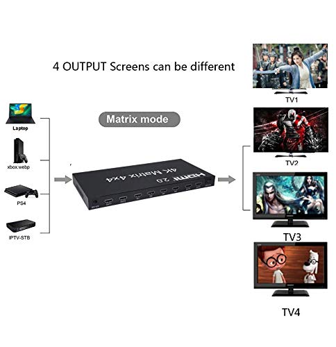 - HDMI Matrix 4 in 4 out: This HDMI Matrix Switch 4x4 can connect 4 HD signal sources to 4 HD display terminals. The matrix allows4HDMI devices to be switched or split easily to 4 HDMI compatible monitors or projectors. It supports HDCP 2.2, HDMI2.0b, 4K@60HZ, RGB4:4:4, YUV 4:4:4, 4K HDR. This 4x4 HDMI Matrix Switch can also control by a IR remote control. After you had set the EDID, Please restart your HDMI Matrix Switch.