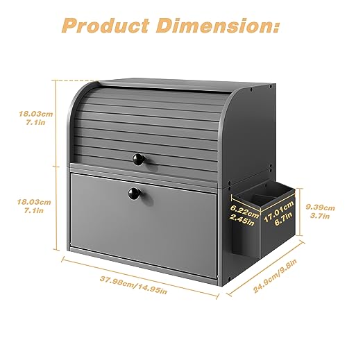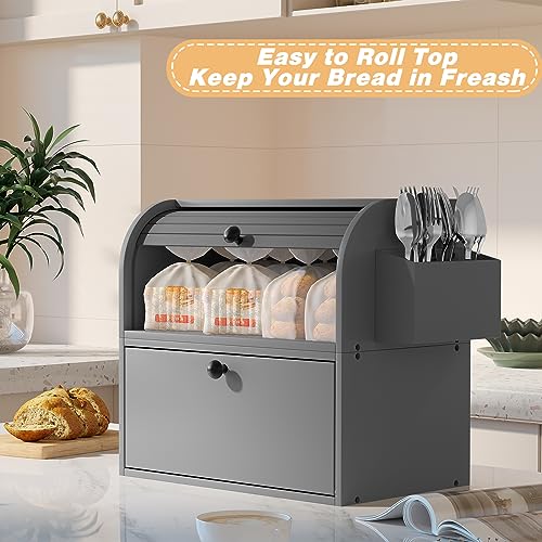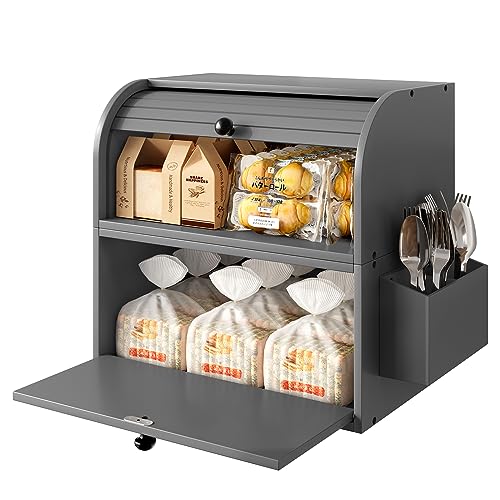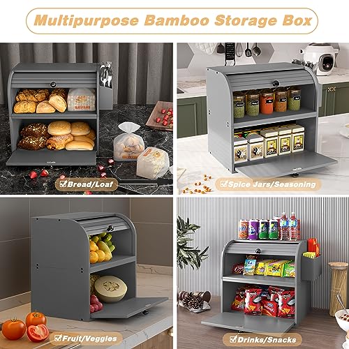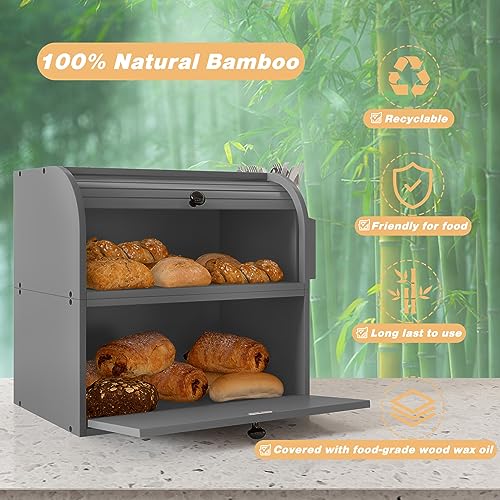 TQVAI - TQVAI Bread Box for Kitchen Countertop, Double Layer Bamboo Bread Storage Container, Large Bread Bin with Silverware Holder - Assembly Required, Grey