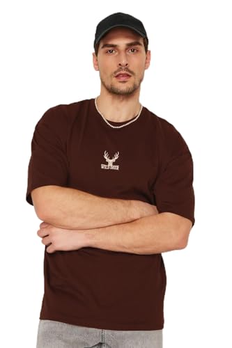 Trendyol - تيشرت كبير الحجم مطرز على شكل غزال من القطن بنسبة 100% طراز TMNSS24TS00055 للرجال من ترينديول، لون بني غامق