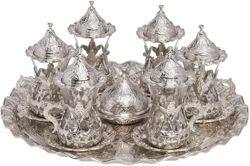 Generic - Turkish Tea Set, 6 PC Silver Ottoman Style, Tea Glasses with Saucers and Lids, Wedding Gift Set