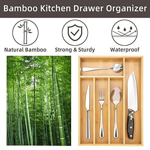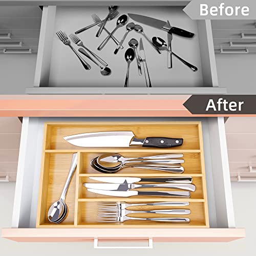 - ✅【Delicate and Well-made】Our silverware tray for drawer is made of natural bamboo, which makes the silverware organizer durable enough for long time use. The Environmentally material keep our flatware & utensil water and odor resistant. Even the knife won't leave scratch on it. Unlike the plastic and metal drawer organizer, our silverware tray more classic and natural, the color and texture of the kitchen drawer organizer is natural and even.