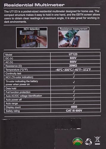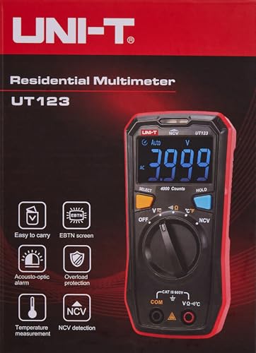 - UT123T هو مقياس سكني متعدد بحجم الجيب مصمم خصيصًا للاستخدام المنزلي، الهيكل المدمج يجعل من السهل حمله بيد واحدة. تسمح شاشة اي بي تي ان للمستخدمين بالحصول على قراءة واضحة بأقصى زاوية، يتوافق المقياس المتعدد مع EN61010-1:2010.
