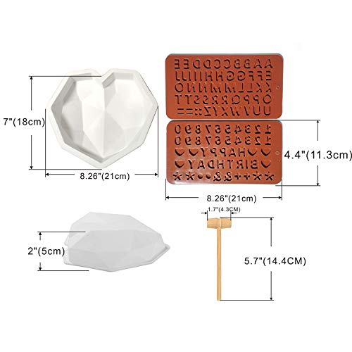 - الحجم: حجم قالب القلب الماسي: 8.26 انش (21 سم) × 7 انش (18 سم) × 1.97 انش (5 سم) ، كما هو موضح في الصورة؛ قالب الحروف/ الأرقام: 4.4 انش (11سم) × 8.26 انش (21 سم) (الطول × العرض)، المطارق: 5.7 انش (14.5 سم) الطول