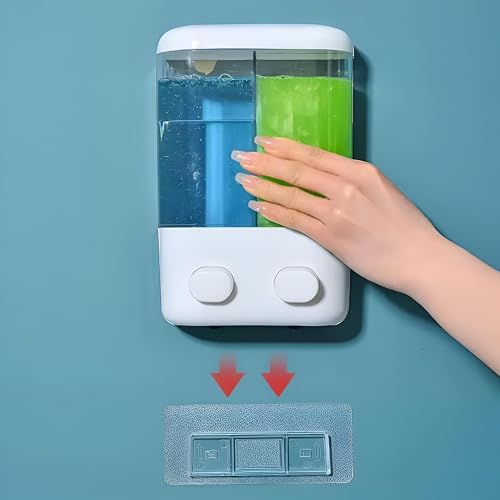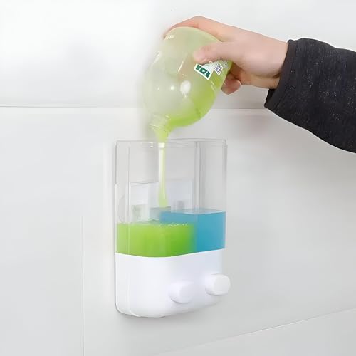 - This dual-compartment wall-mounted dispenser offers two separate, transparent chambers that allow simultaneous and convenient access to two different liquid products—such as shampoo and body wash in the bathroom, or hand soap and dish liquid in the kitchen—enhancing organization and reducing clutter on countertops.