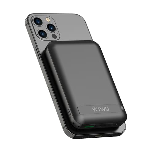 WiWU - باور بانك من ويوو بسعة 10000 مللي أمبير ببطارية ليثيوم ايون ومنفذ USB-C مع شحن لاسلكي مغناطيسي وحامل مدمج للهواتف والتابلت، لون أسود