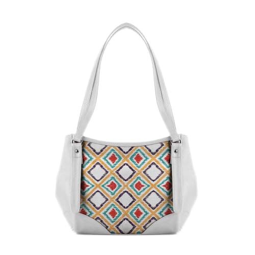 Generic - Women's Geometric Pattern Tote Bag, White Leather with Multicolour Design, Shoulder Handbag
