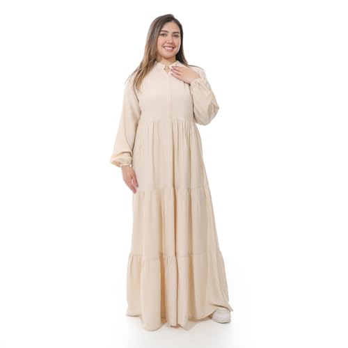 Generic - فستان كتان نسائي طويل، لون بيج فاتح , أكمام طويلة منتفخة، تصميم كلاسيكي أنيق، مناسب للمناسبات اليومية