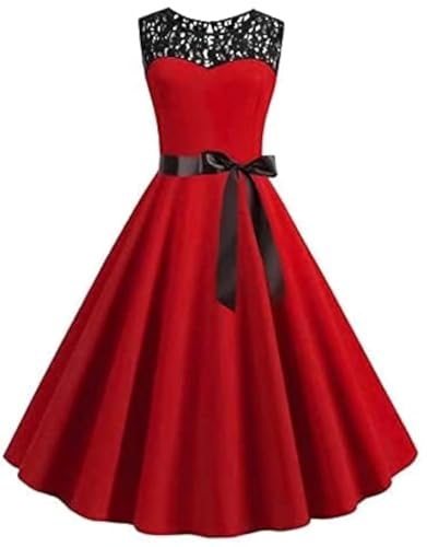 Generic - Women's Red Dress With Black Lace And Black Satin Belt