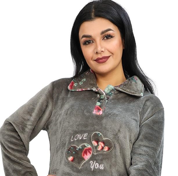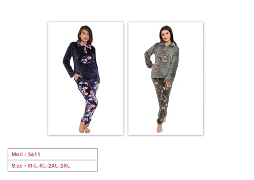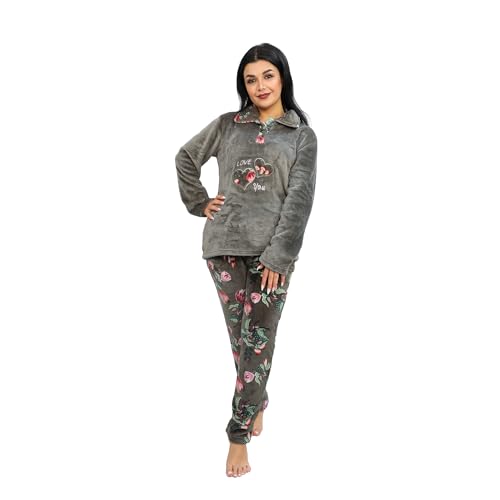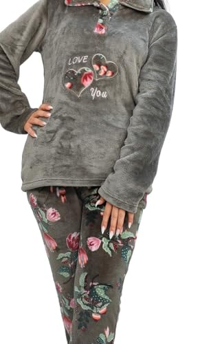 Dadoush - Womens Winter Fur Floral Pajama Set 2 Piece Top and Pants - Winter Women's Fur Lined Pajama Set - 2 Pieces Plaid Pants and Embroidered T-Shirt