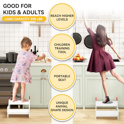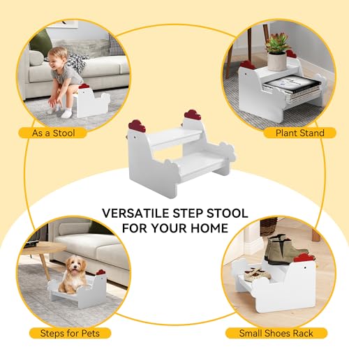 - 【Cute and Safe Design&Multipurpos Stool】The kids step stool is designed in the shape of a chick, it's a perfect gift for children. Don't think that a crooked nose and a raised butt of the toddler kitchen stool are unsafe, the outer force points of our pedals are firmly placed on the nose and legs of the bathroom stool to ensure that they don't fall over. Otherwise, the multifunctional kids stool can be a toilet training stool, a plant stand, a pet steps, or a small shoes rack.