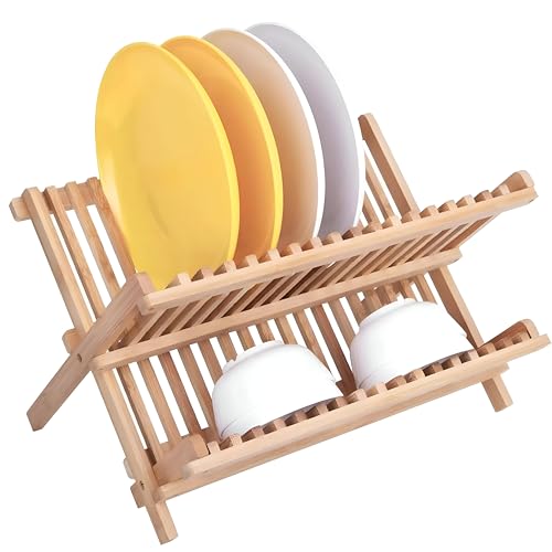 Generic - رف اطباق خشبي - تصميم انيق قابل للطي من طبقتين للاطباق والنظارات وادوات المطبخ، حل منزلي موفر للمساحة