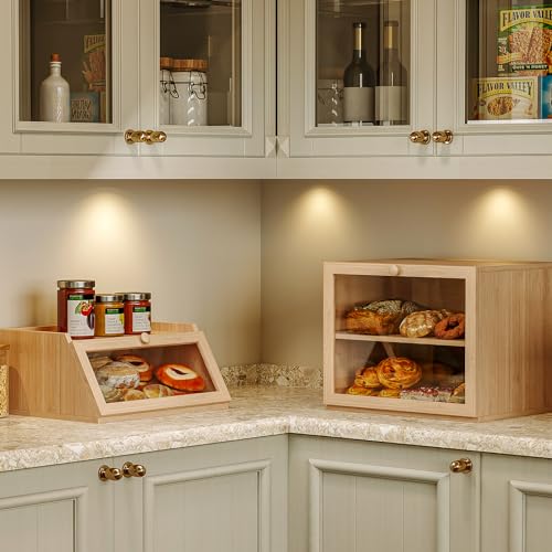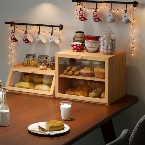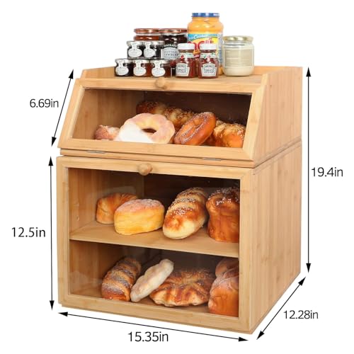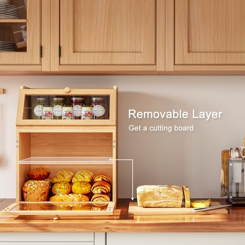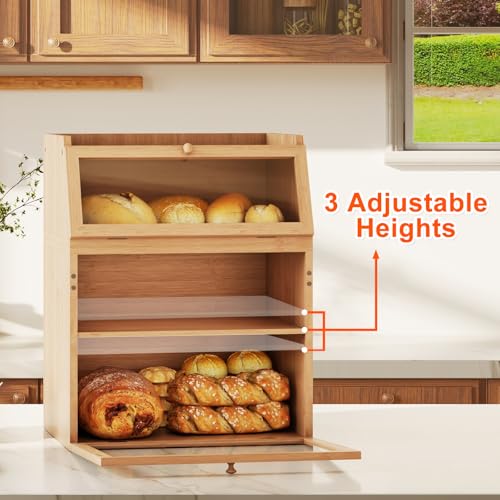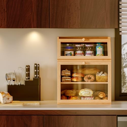 X-cosrack - X-cosrack 3-Tier Extra Large Double Separable Bamboo Bread Box Storage with Clear Window and Adjustable Compartment for Kitchen Countertop,Natural