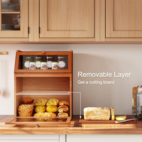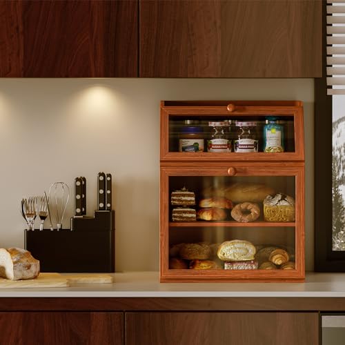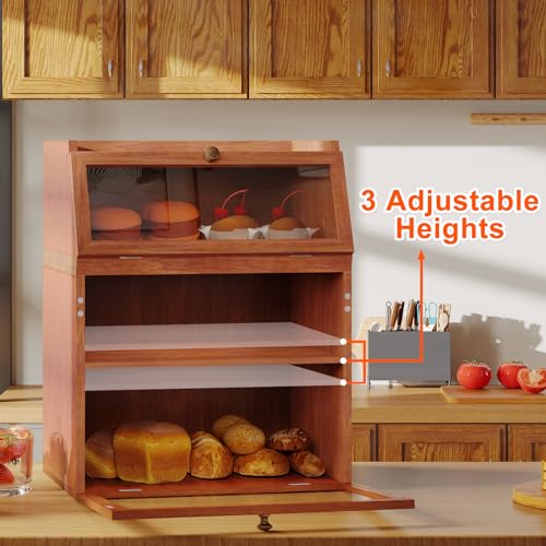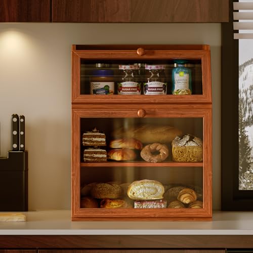 X-cosrack - X-cosrack 3-Tier Extra Large Double Separable Bamboo Bread Box Storage with Clear Window and Adjustable Compartment for Kitchen Countertop,Red
