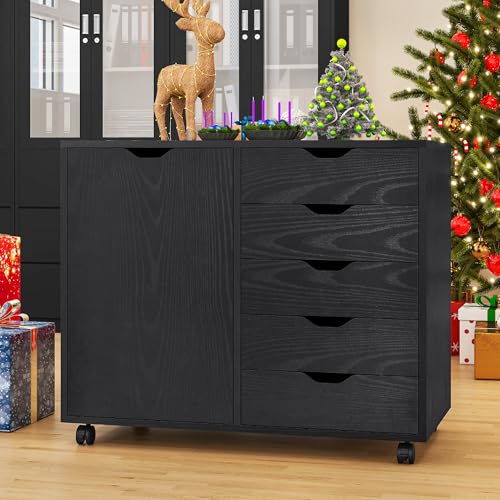 YITAHOME - YITAHOME Office Storage Unit, Office Cabinet, 5 Drawers One Door, Sideboard, for Documents, Printer Stand on 4 Mobile Wheels, Desktop Cabinet, Drawer Cabinet (Black)