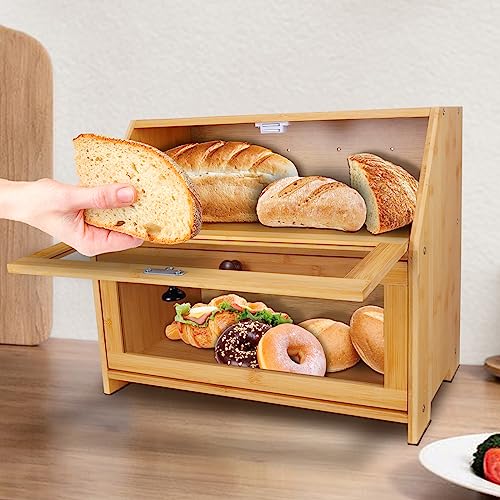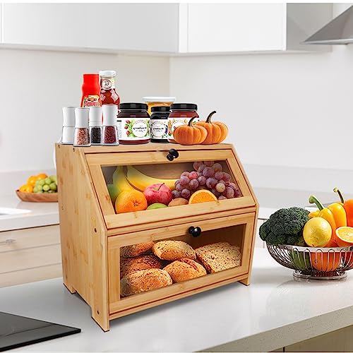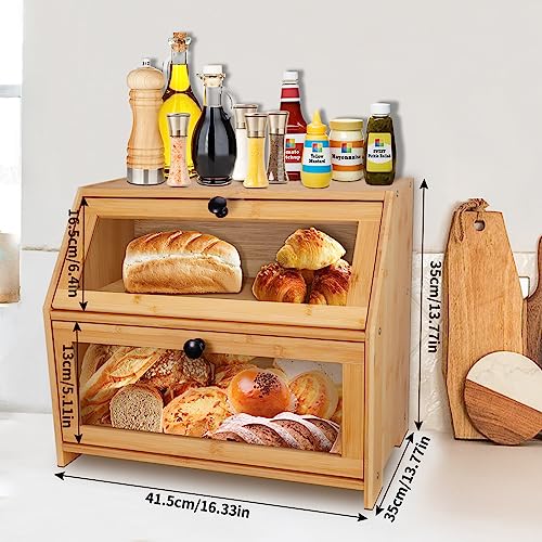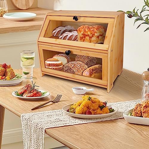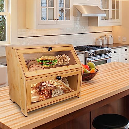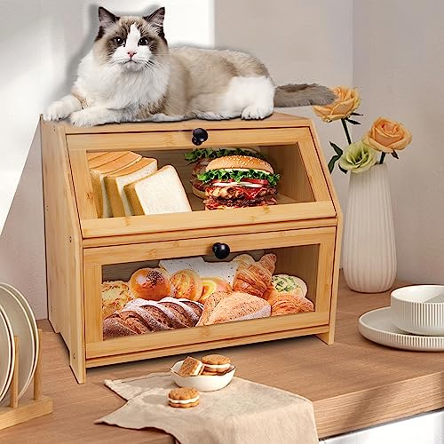 YOSE - عياشة للمطبخ من يوس مزدوجة الأرفف البامبو بسعة كبيرة - حاوية تخزين الطعام بجزء أمامي شفاف مع غطاء صندوق للخبز والمعجنات والمزيد تجميع-ذاتي