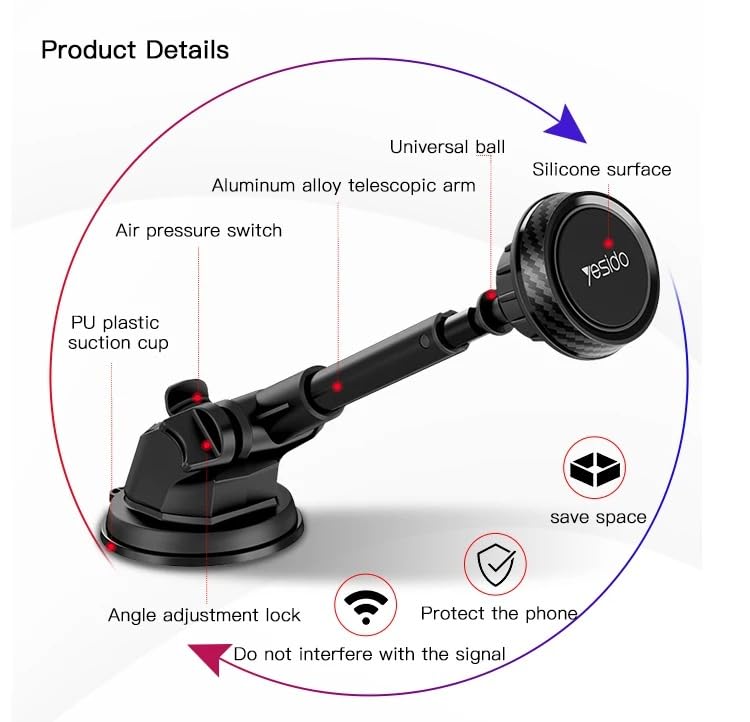 - [Strong magnet for stable stabilization:] : Equipped with high strength magnet ensure the phone is securely fixed without vibration even while driving on uneven roads. Keeps the device in place and provides a secure grip, ensuring a safer and more comfortable driving experience without worrying about phone falls or accidental shift.