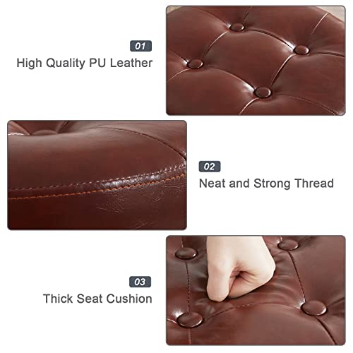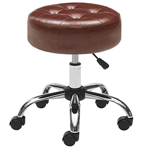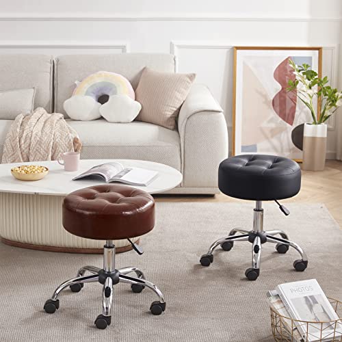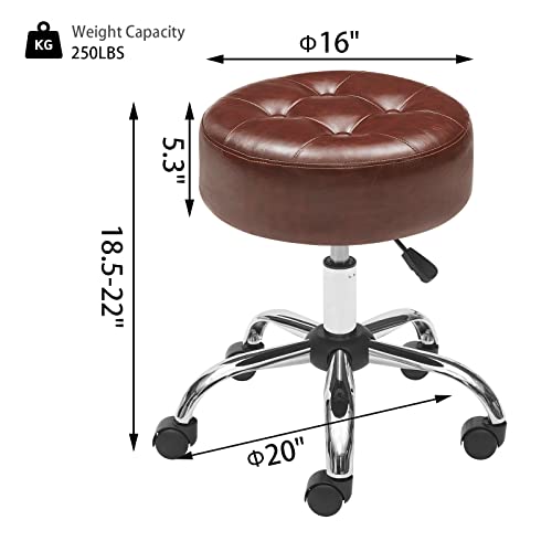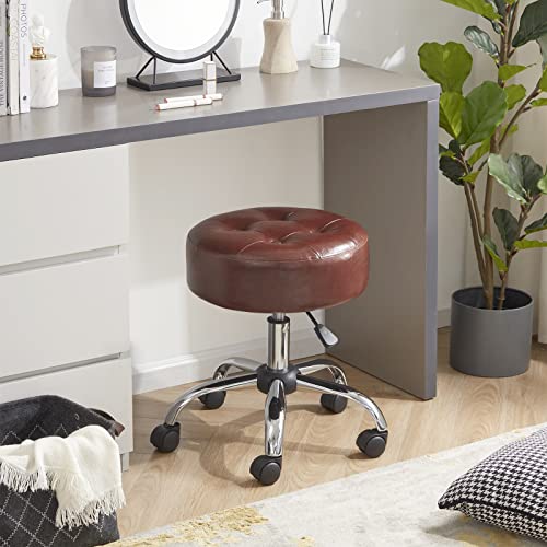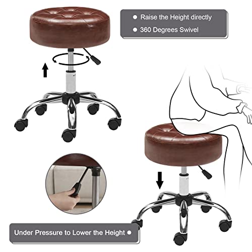 Brown Rolling Stool Chair Adjustable Stool with Wheels Salon & Spa Stools Medical Stool Esthetician Chair Round Ottoman Swivel Vanity Chair with Tufted PU Leather Seat