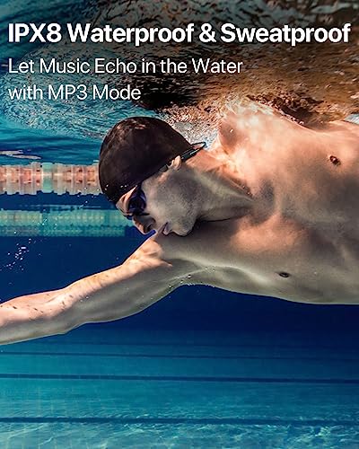 - IPX8 waterproof headphones: the MP3 swimming headphones have an IPX8 waterproof rating that makes them suitable for swimmers and allows you to wear both a swimming cap and swimming goggles. They are also suitable for running, cycling, fitness, etc. Please note: Bluetooth connection is not supported underwater, use MP3 mode instead.