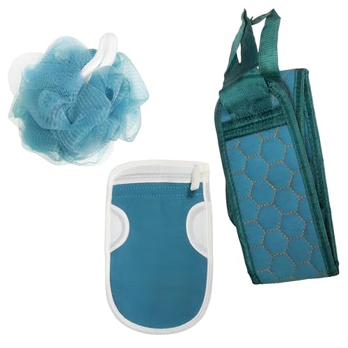 مجموعة الاستحمام الأساسية المكونة من 3 قطع مع فرشاة تنظيف للجسم والظهر، تتميز بوجود وسادة تقشير مريحة ، مثالية لكل من الرجال والنساء، (ازرق)