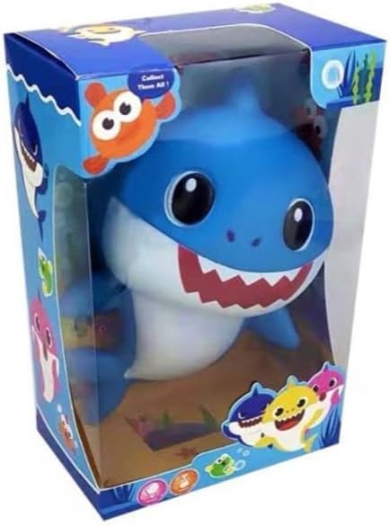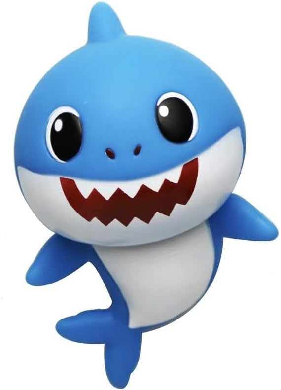 لعبة أطفال من البلاستيك على شكل سمكة قرش صغيرة بوجه مبتسم، أزرق
