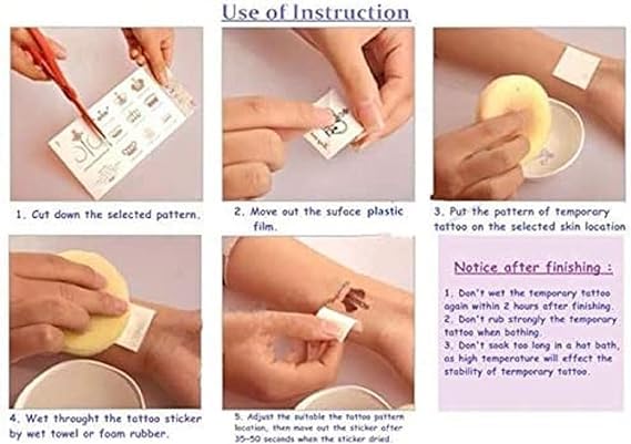 - Type: Tattoos Brand: Other Water Resistant Sweat Proof Non-Toxic. Age: 16 Years & Above Size:21*15 cm How to use: Remove the transparent film on the surface of the pattern, attach the front of the sticker to the skin, spray the sticker with a damp cloth or a sponge, and then gently tap the water until the sticker is completely wet. The pattern is printed on the skin until the sticker is completely detached. -To remove, simply moisten with oil, wait a minute, then gently scrub off.