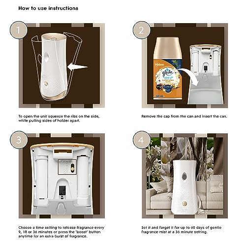 - Choose one of three time settings or press the button for an extra burst of fragrance anytime Up to 60 days of freshness