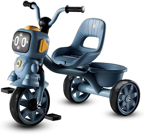 دراجة ثلاثية العجلات للأطفال مع ضوء وموسيقى وسلة تخزين خلفية و3 عجلات للأطفال من عمر 2 إلى 5 سنوات للأولاد والبنات من هابي كيدو، لون أزرق سماوي (لون أزرق)