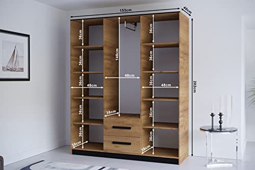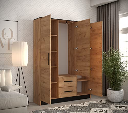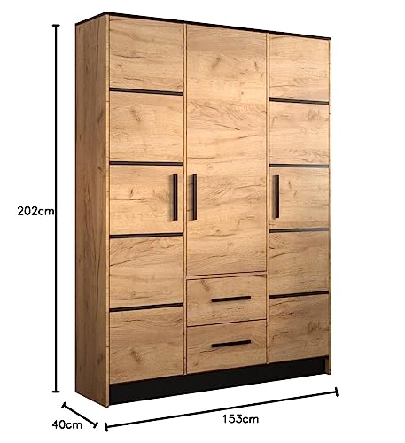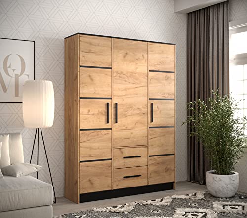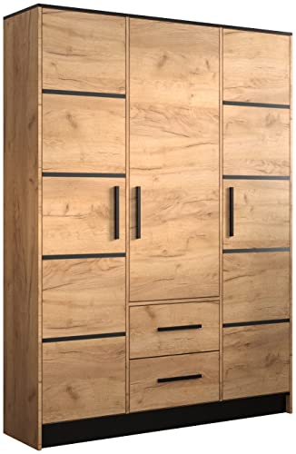 MEBLE KRYSPOL Malta 153 Hinged Door Wardrobe with 3 Doors, 2 Drawers and Mirror, Modern Design (M1 Oak Kraft Gold/Oak Kraft Gold + Black)