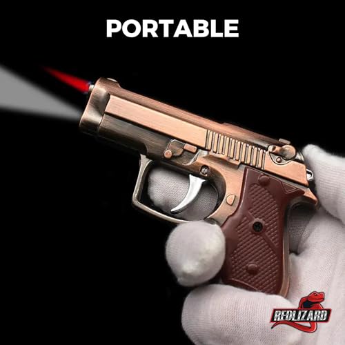 REDLIZARD Vintage Gun Lighter with Integrated LED Light, 10 cm, Adjustable Flame, Refillable Butane Gas (Copper)