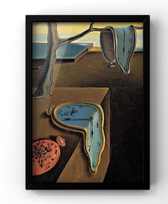 لوحة فنية جدارية مطبوعة على شكل لوحة ثبات الذاكرة بنمط ساعة ذائبة في منظر صحراوي سريالي للفنان سلفادور دالي بإطار أسود، مقاس 30 × 40 سم، مقاس متوسط M