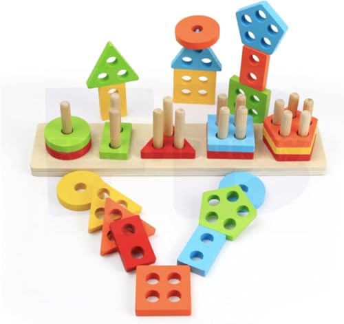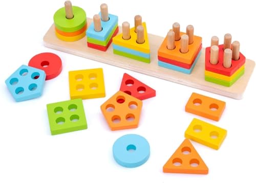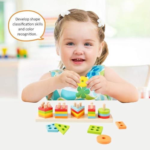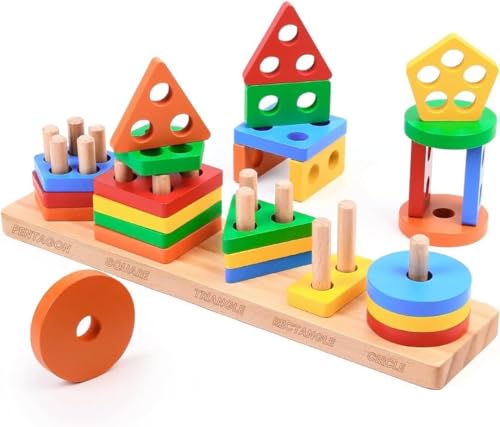 KIDSZONE Montessori Toys for 1 2 3 Years Old, Wooden Sorting & Stacking Toys for Toddlers 1-3, Education Preschool Toddler Puzzles,Best Gift. (5 shapes)