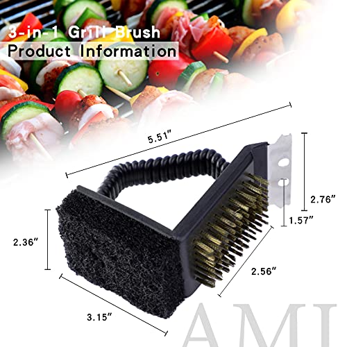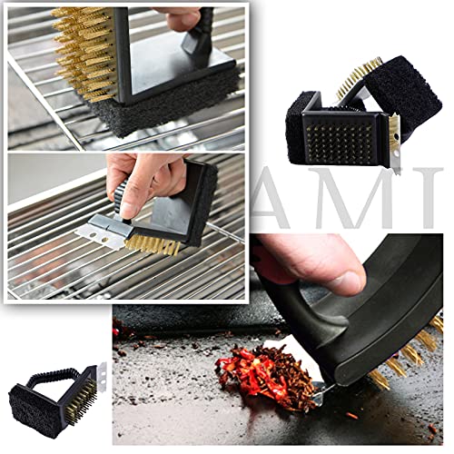 AMJ 2 Pcs Grill Brushes Three-in-one (Grill Sc, Copper Wire Brush, and Sponges), Multi-Purpose Grilling Accessories, Safe Easy Right Angle Barbecue Cleaner Black