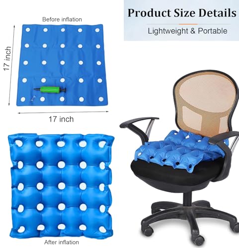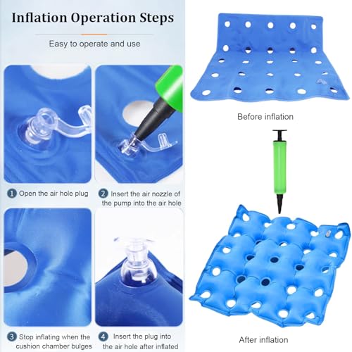 - 【2PCS Inflatable Seat Cushion】Our chair cushion can be inflated fast with the included hand pump. You can easily adjust the air level and firmness for your specific body type by adding or removing air. Deflation is as easy as Inflation. Just pinch the mouth of the valve and squeeze the cushion to let air out quickly.