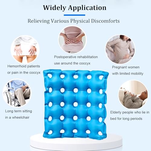 - 【Comfortable and Dry Feeling】The inflatable seat cushions for sitting provides comfortable, stress free sitting and dry feeling with a gentle layer of air that helps to eliminate pressure points, the small ring shaped holes of our inflatable seat cushion for travel ensure body weight is evenly distributed without putting pressure on your lower back and prevent bedsores